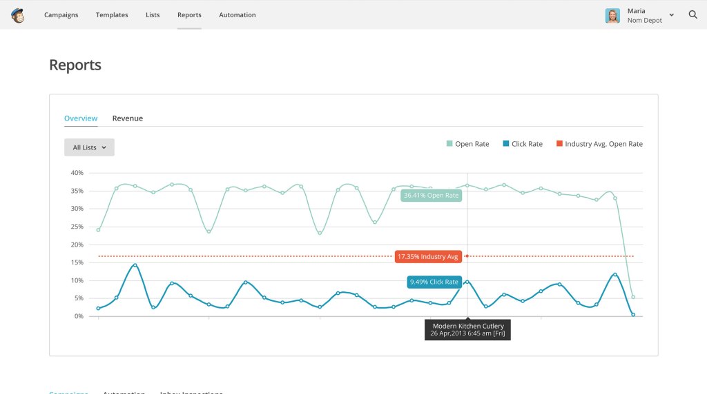 Like some others it uses Google Analytics to give you highly detailed reports on your campaigns, such as open and click through rates, bounces and unsubscribes.